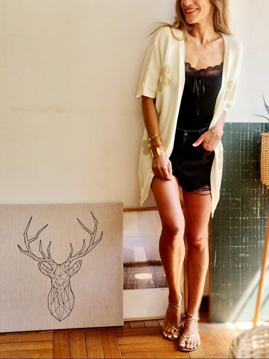 CHALECO FLOR BRILLO CREMA.-50% Dcto