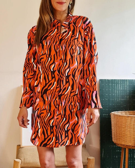VESTIDO CAMISA PRINT NARANJO/FUCSIA -50% DE DCTO.