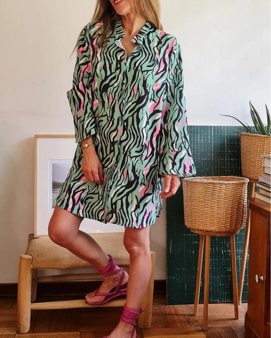 VESTIDO CAMISA PRINT VERDE/FUCSIA -50% DE DCTO.