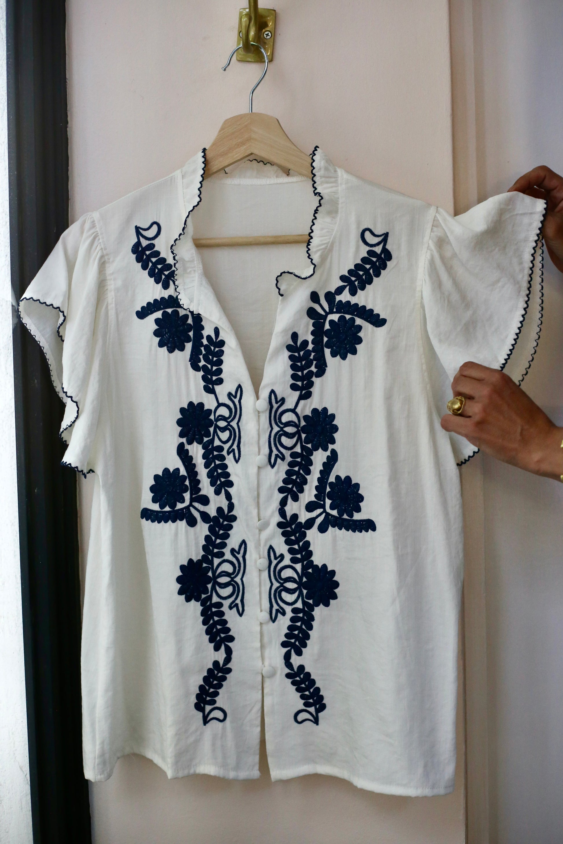 Blusa de tela suave, liviana, muy comoda. Corte recto, cuello V, con borde bordado. Mangas sueltas muy femeninas y comodas. Abotonada, con botones forrados en tela. Precioso bordado central.