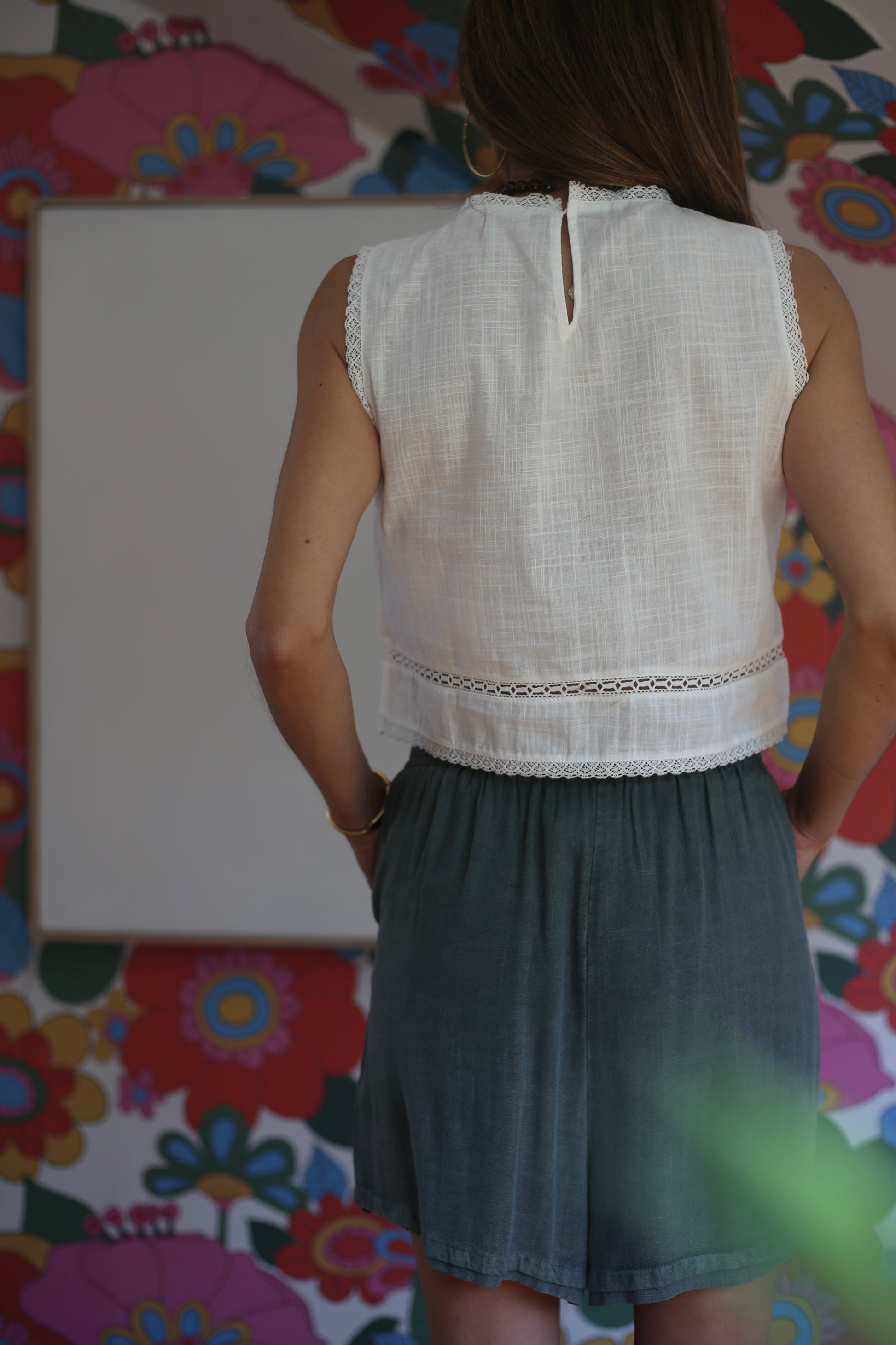 Blusa Domitila de tela viscosa con macrame y bordados. Corte recto con boton en la espalda. De largo intermedio.