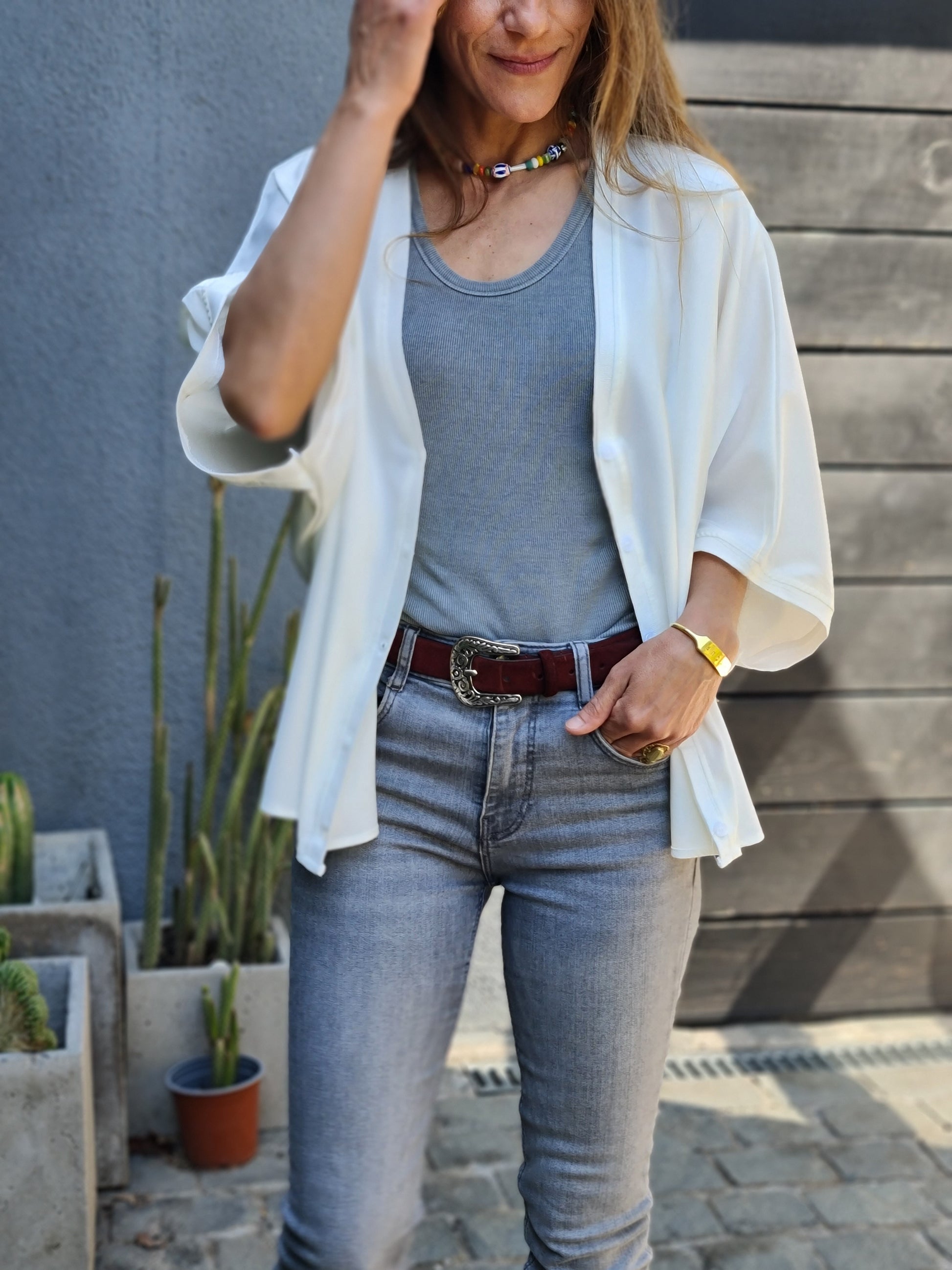 Blusa Rosario Blanco en Satin muy suave y con muy rica caida. Corte ancho, mangas anchas. Pretina con botones. Ideal para usarla con un top abajo, abierta o cerrada. Queda muy bien con jeans y para look oficina o mas formal perfecto también.