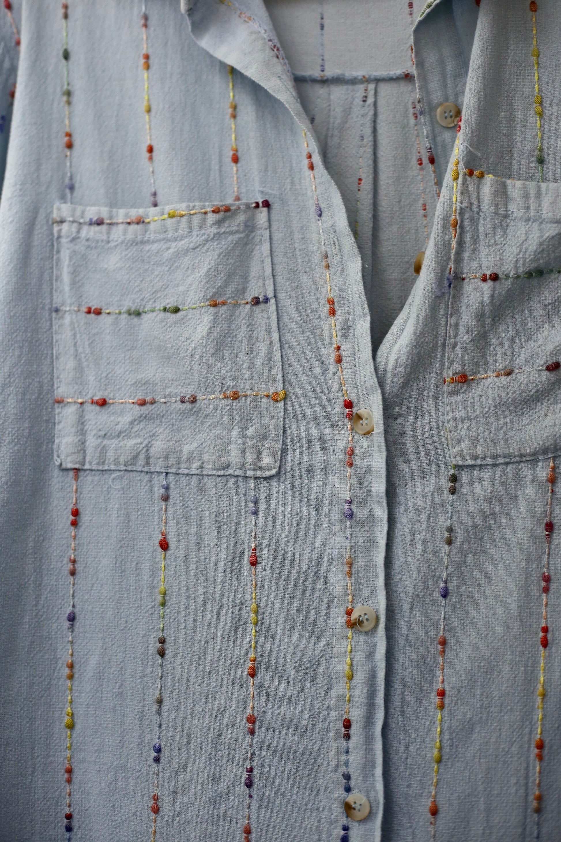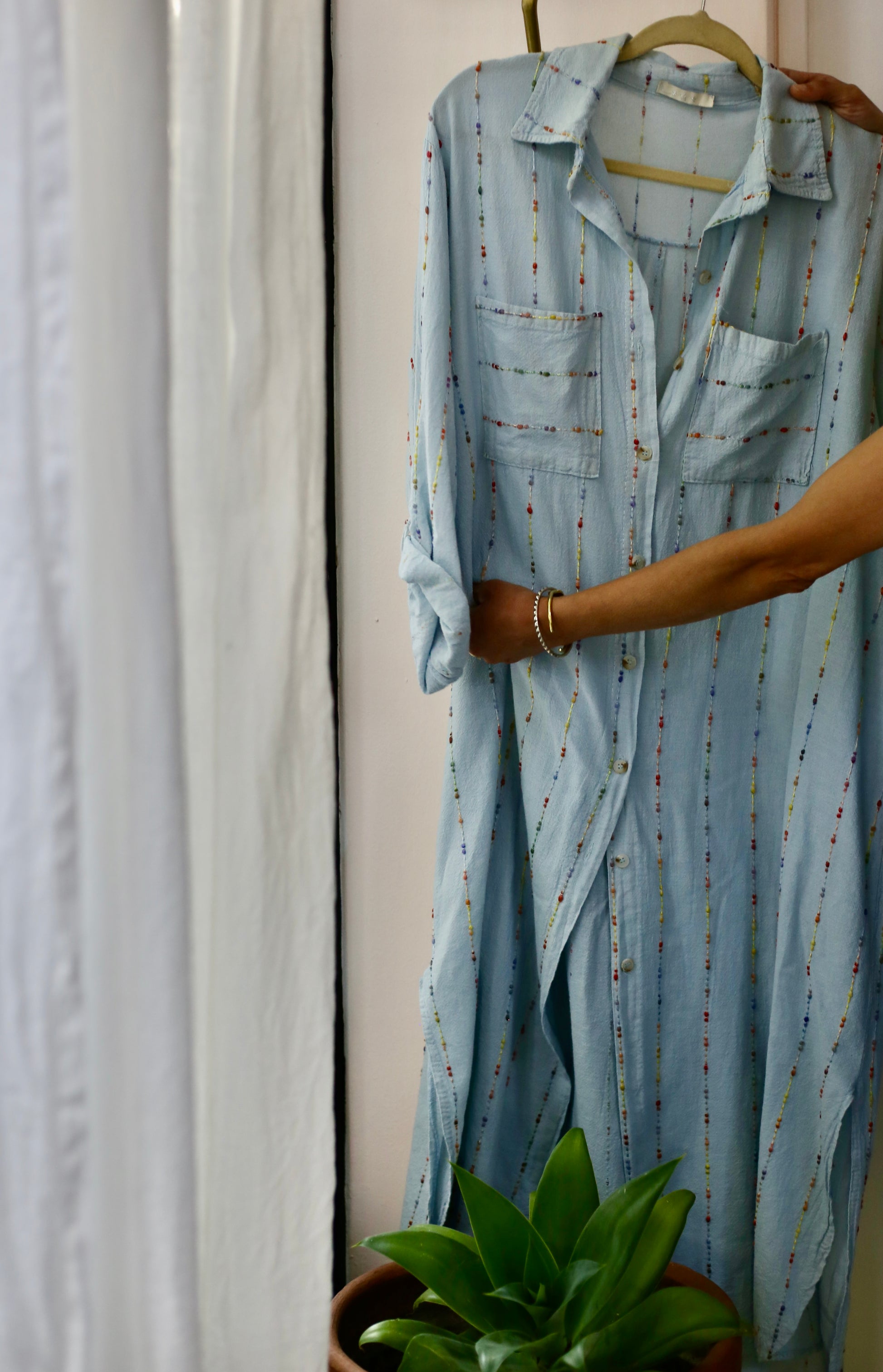 Bluson- Vestido Felicia, 100% Lino. En color Celeste con jaspeado de colores. Cuello camisero, abotonado, dos bolsillos delateros y bolsillos laterales. Super femenino, romantico y extra comodo.