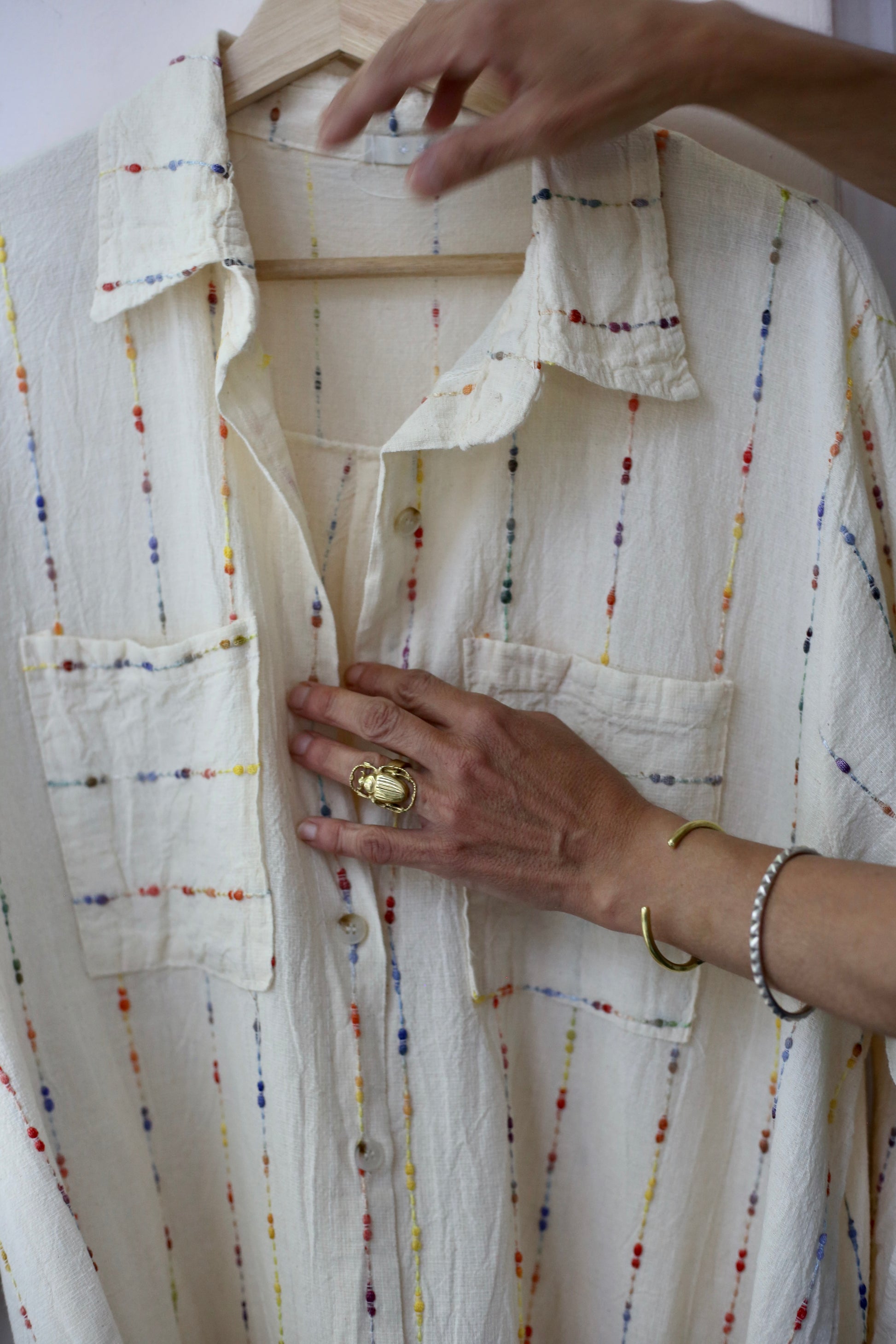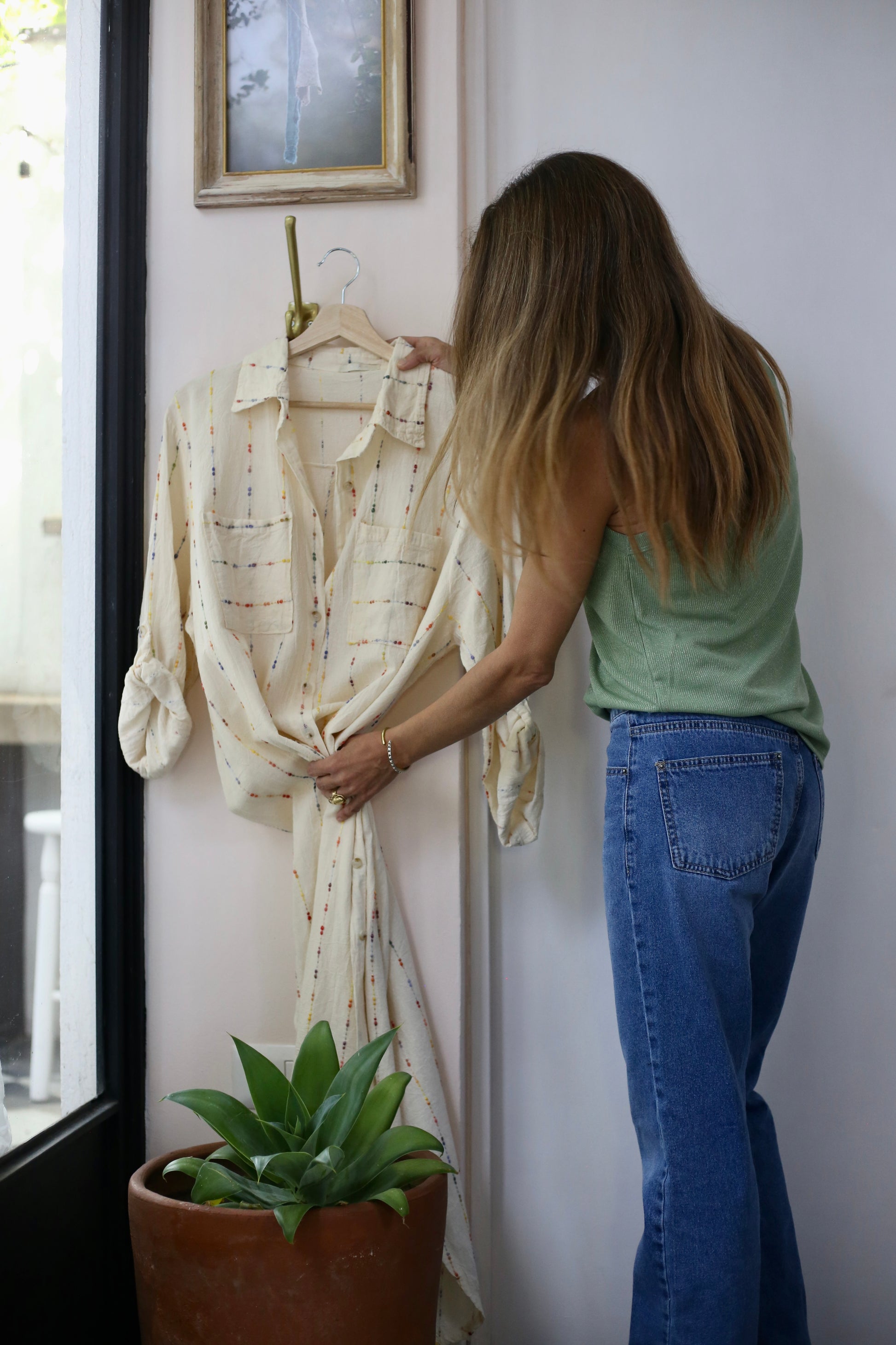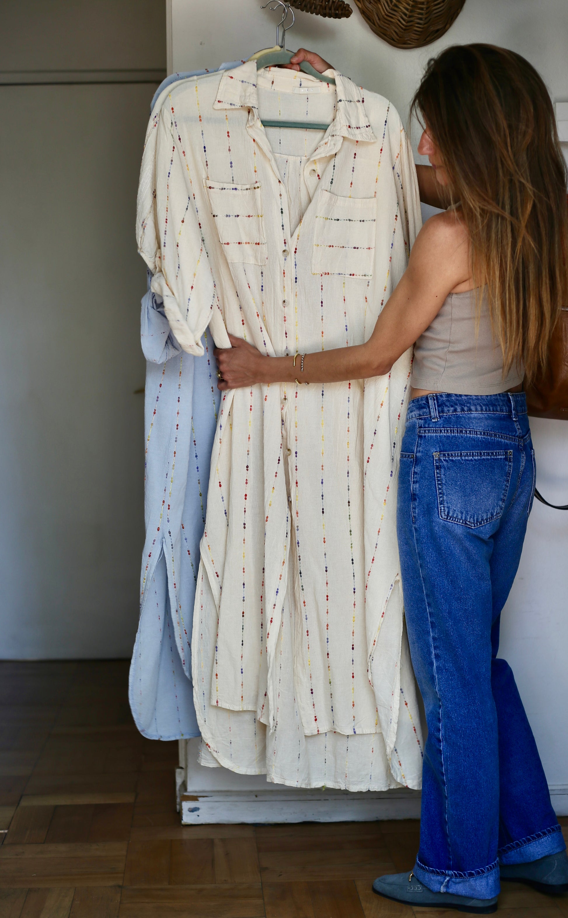 Bluson- Vestido Felicia, 100% Lino. En color Celeste con jaspeado de colores. Cuello camisero, abotonado, dos bolsillos delateros. Super femenino, romantico y extra comodo.