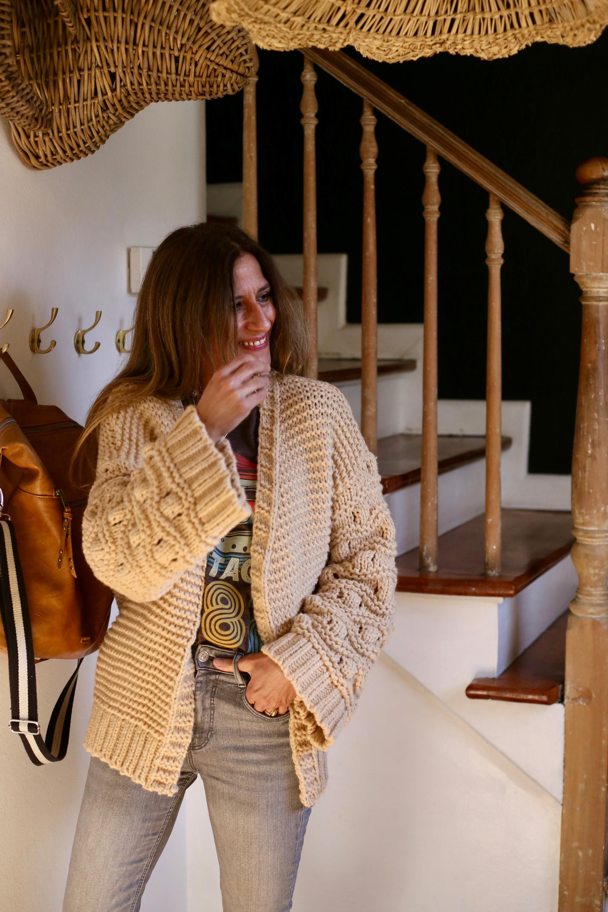 Chaleco Fatima suave y de grosor intermedio grueso. Muy estiloso, con sus mangas en distinto tejido, con mucha onda para usar con jeans y polera. Fatima es de tope, no trae botones.