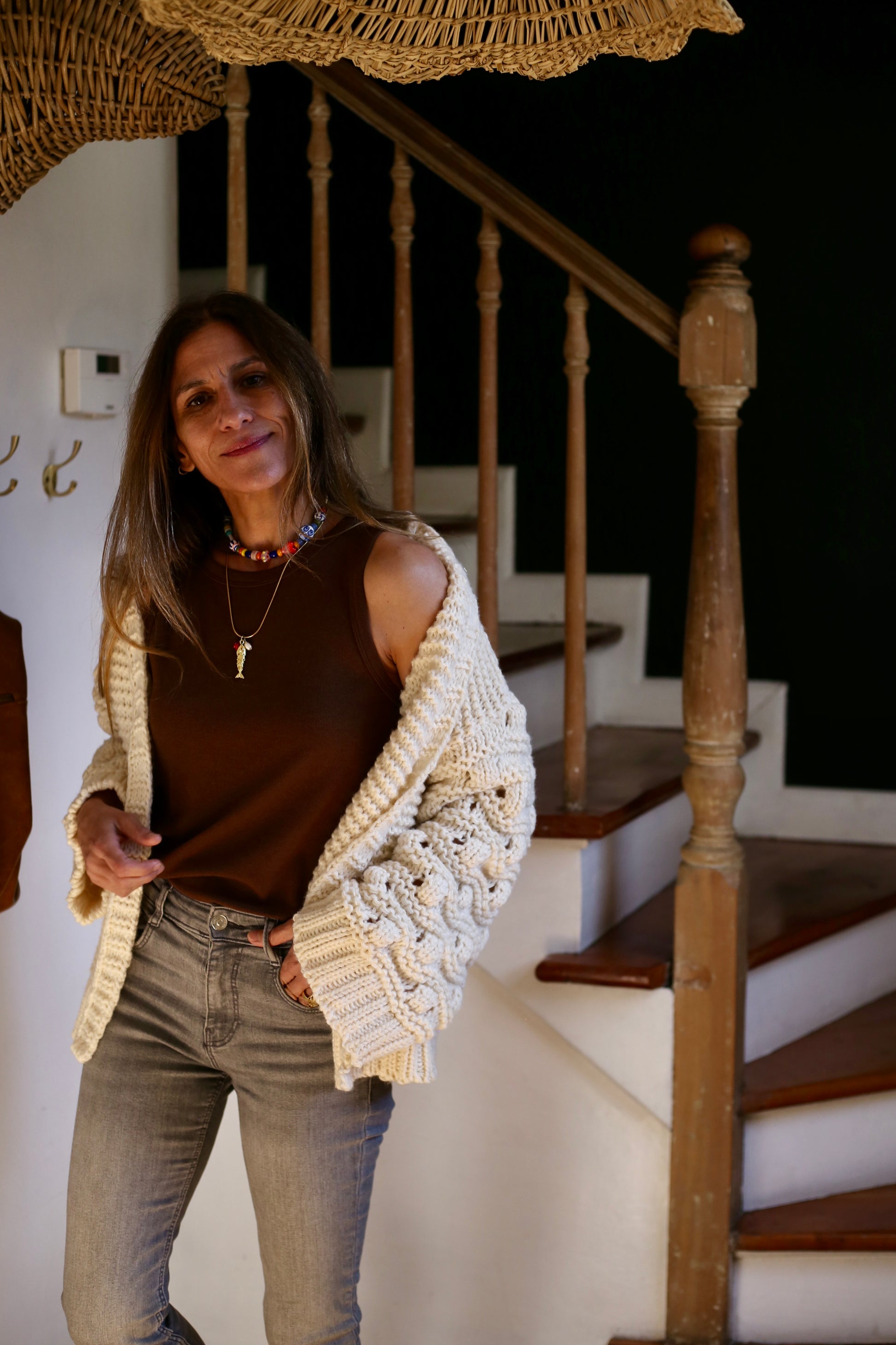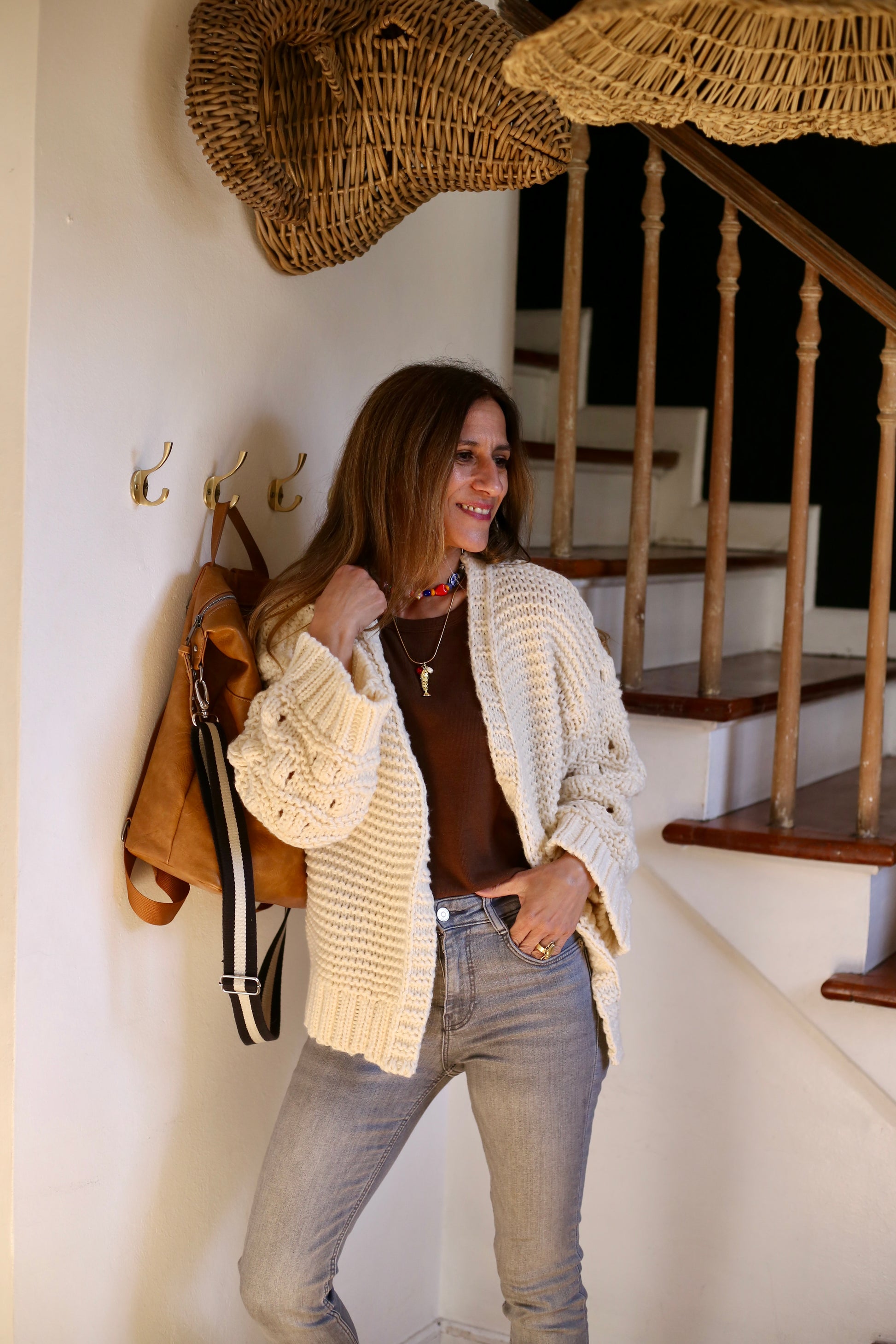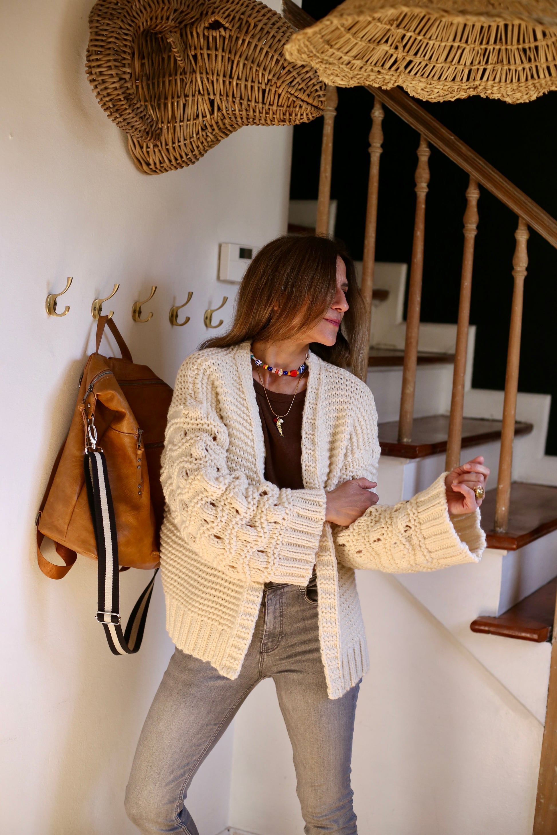 Chaleco Fatima suave y de grosor intermedio grueso. Muy estiloso, con sus mangas en distinto tejido, con mucha onda para usar con jeans y polera. Fatima es de tope, no trae botones.