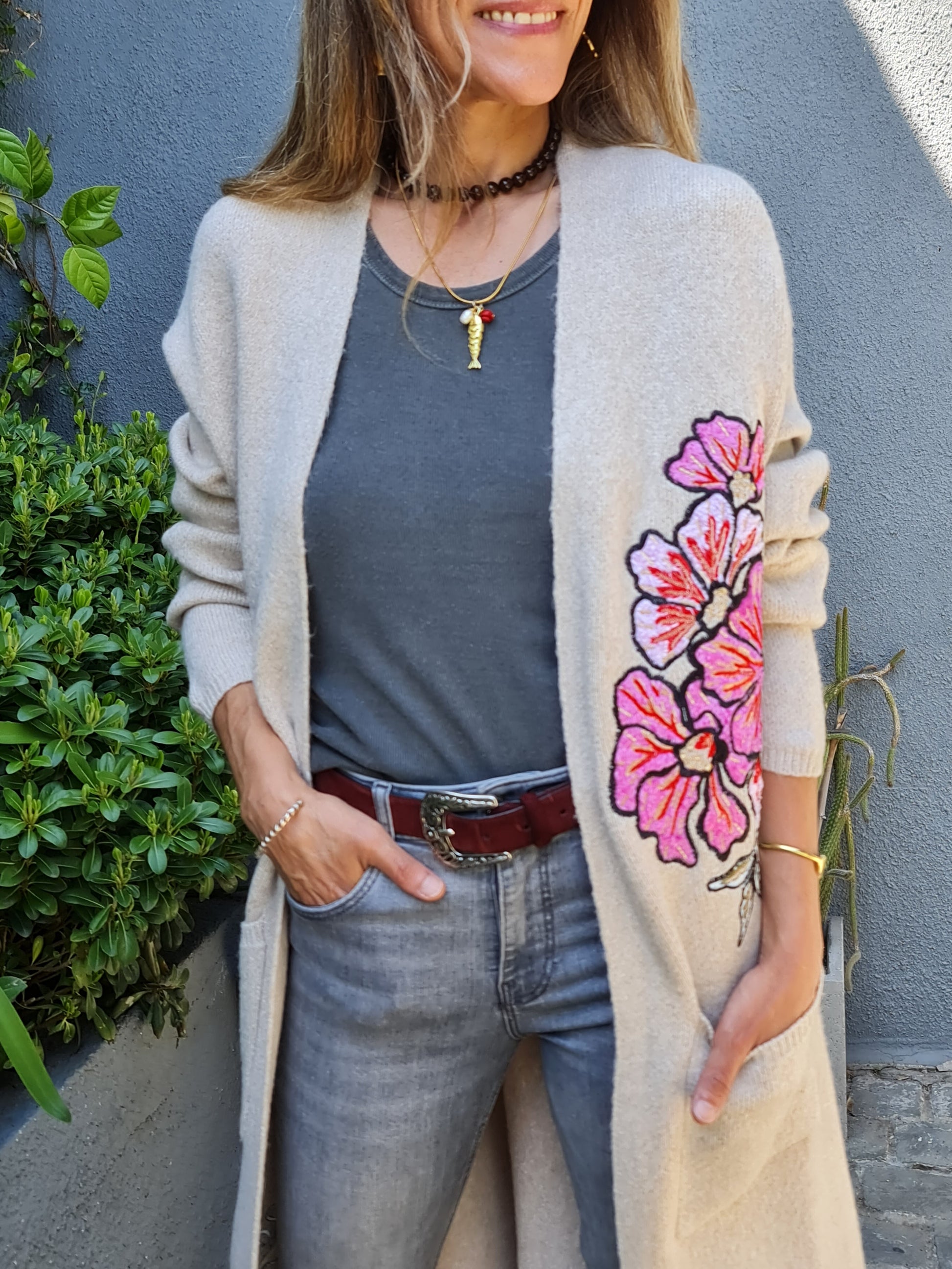 Chaleco de tejido muy suave, grosor exquisito abrigador, pero liviano. Corte recto, bolsillos laterales. Detalle de flor en color fucsia.