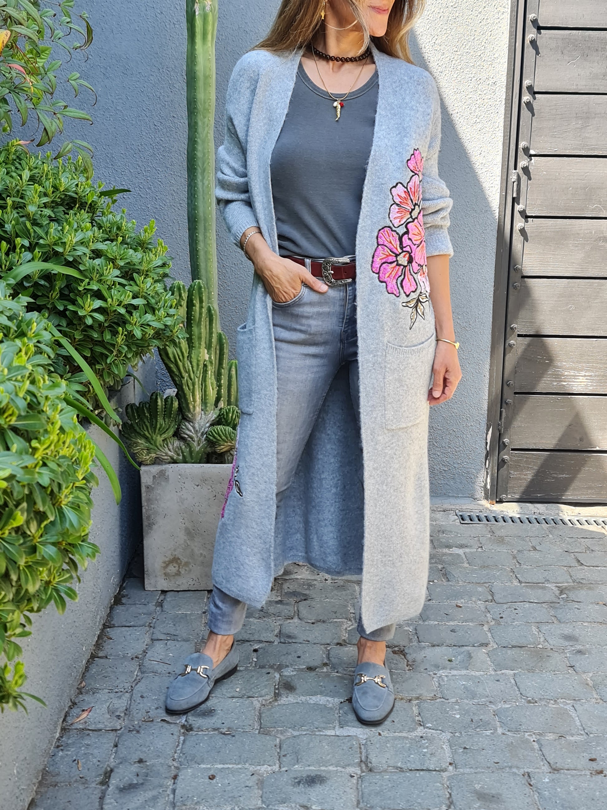 Chaleco de tejido muy suave, grosor exquisito abrigador, pero liviano. Corte recto, bolsillos laterales. Detalle de flor en color fucsia.