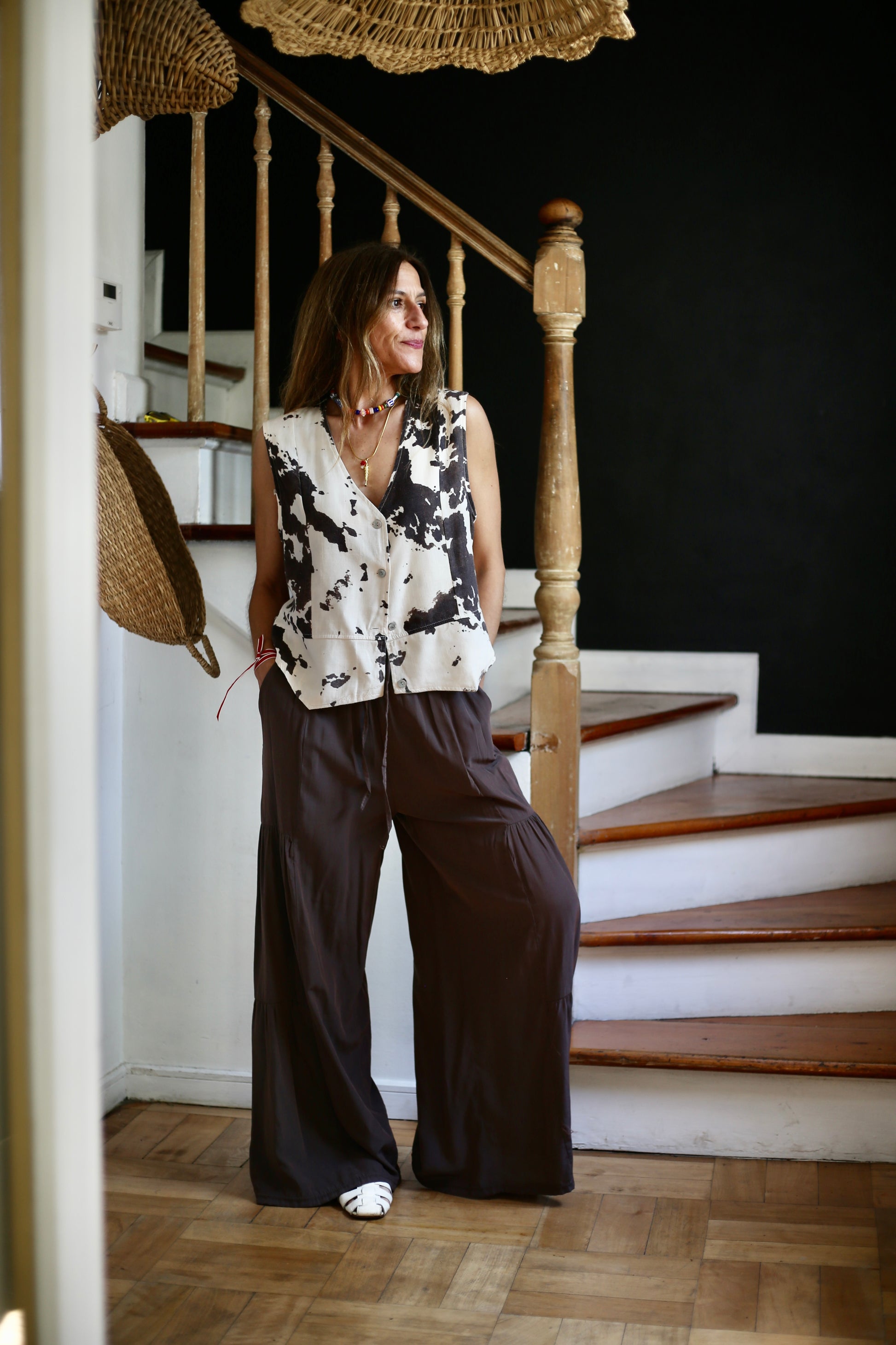 Gillet Tere de Lino en estampado vaca en fondo crema y cafe medio. Liviano, con muy rica caida. Abotonado. Muy ondero para un Look con una polera basica abajo.