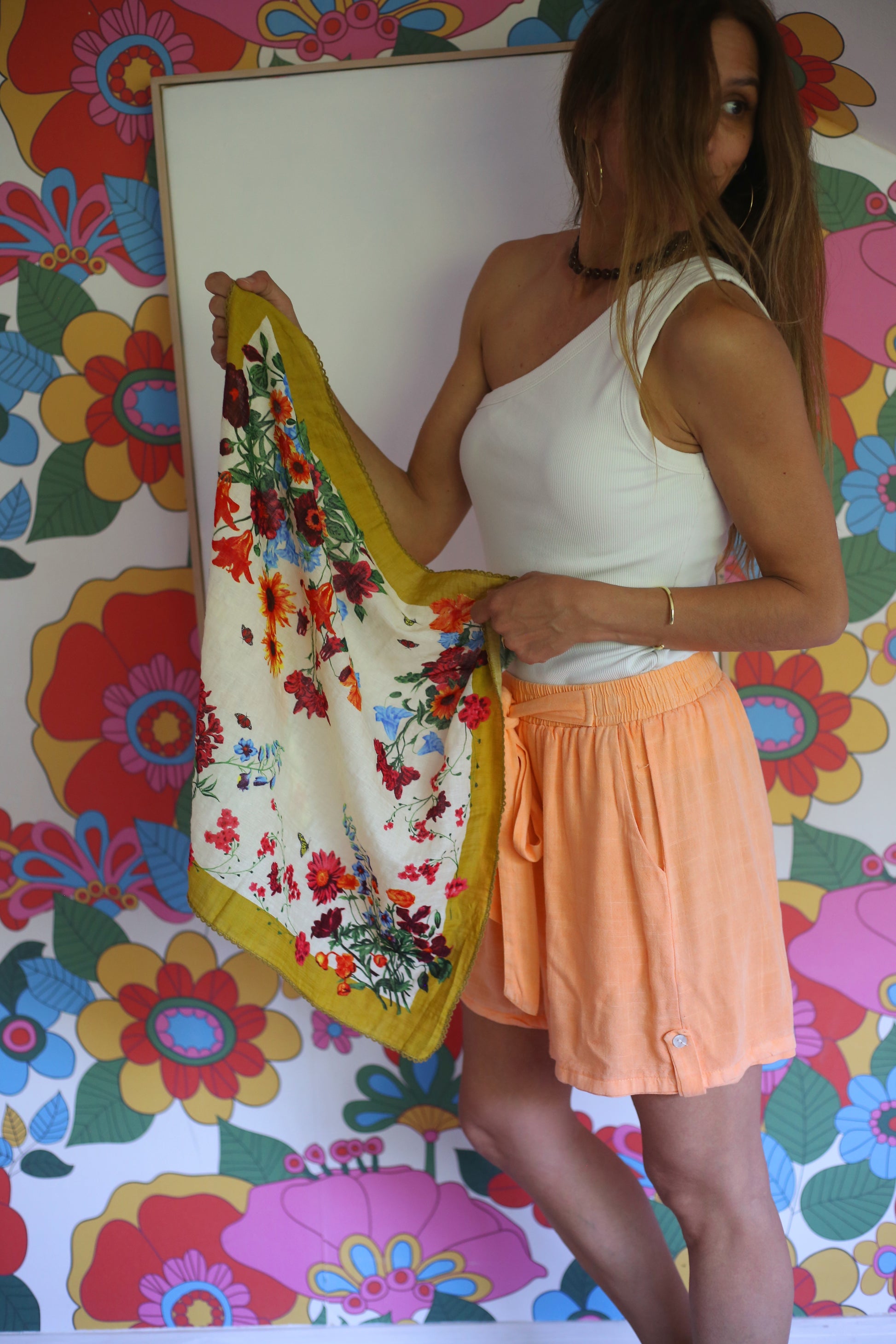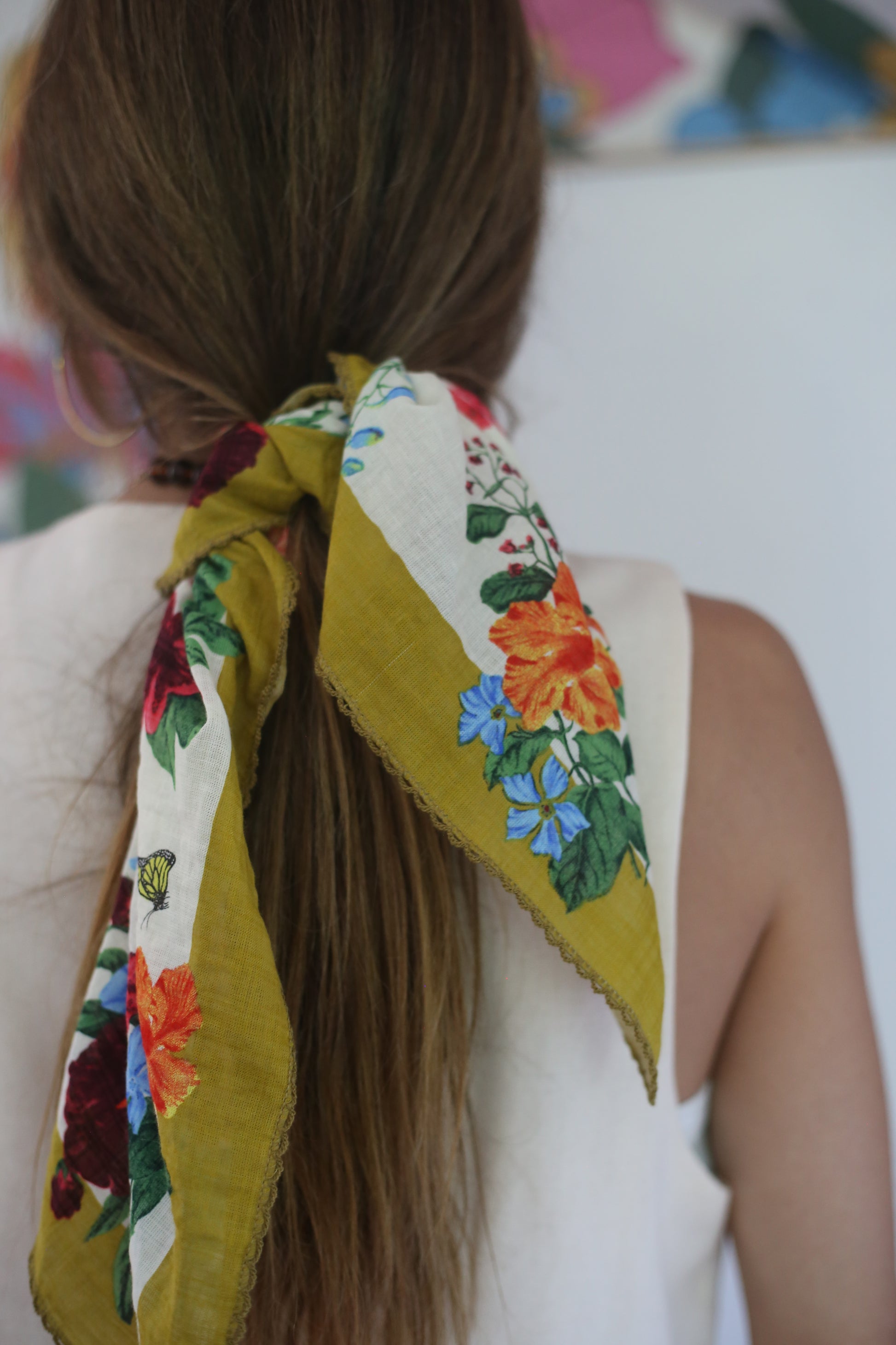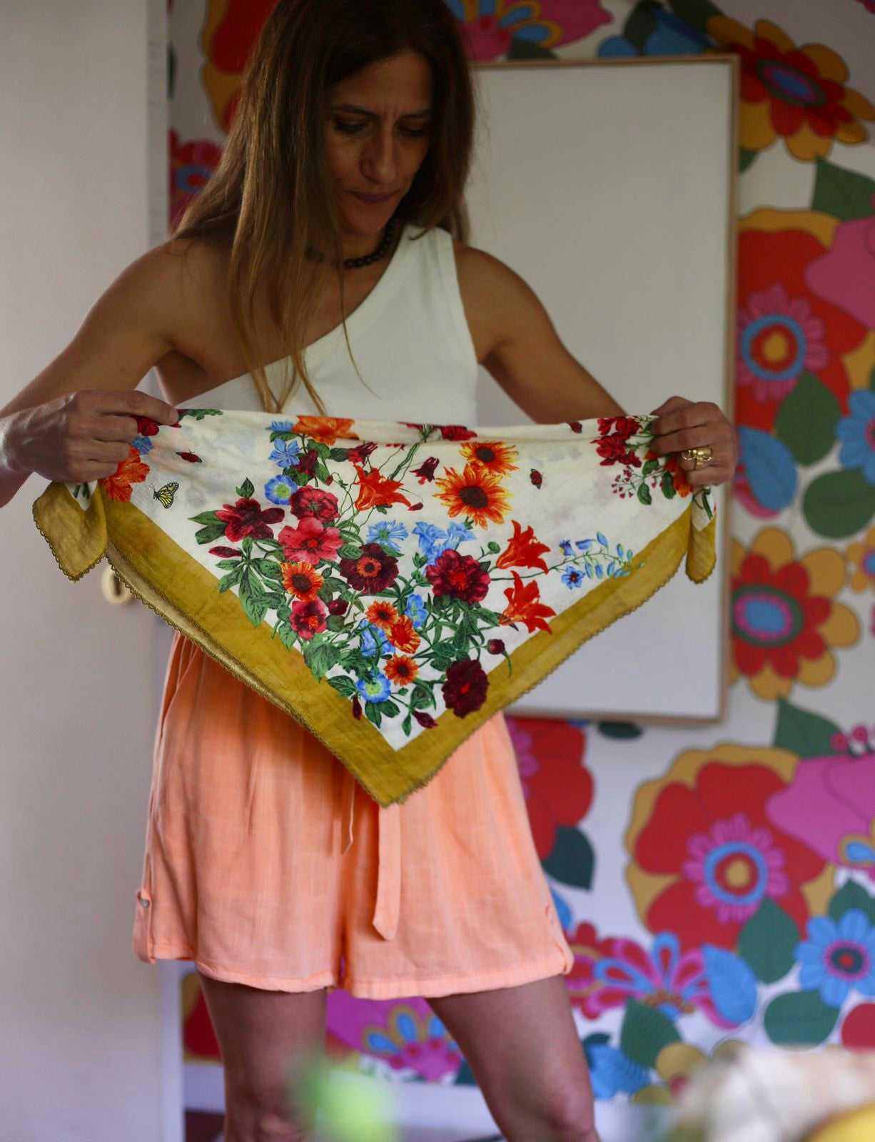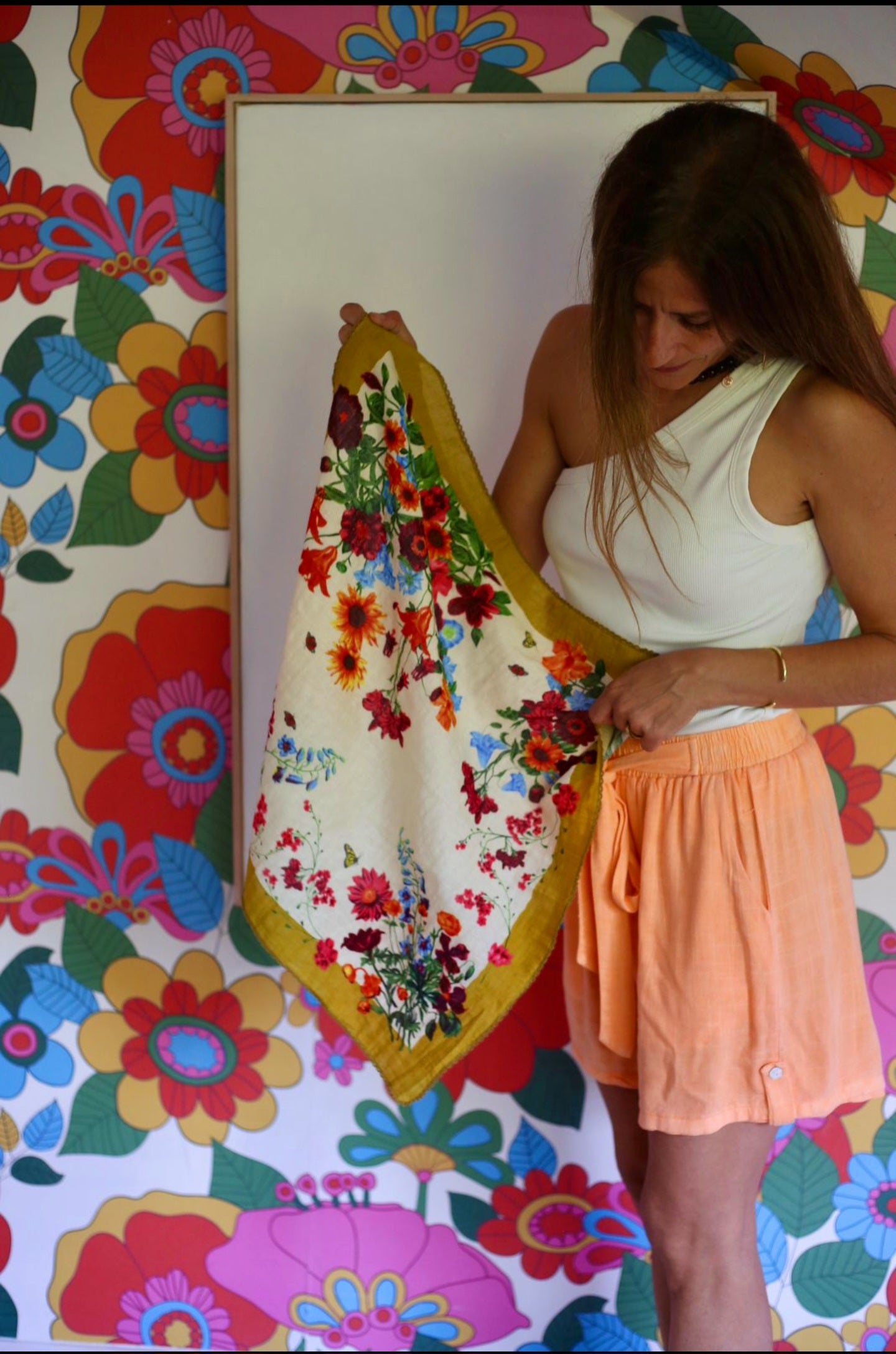 Pañuelo de Viscosa exquisita con una leve textura. Con borde color pistacho y bordado en la orilla.