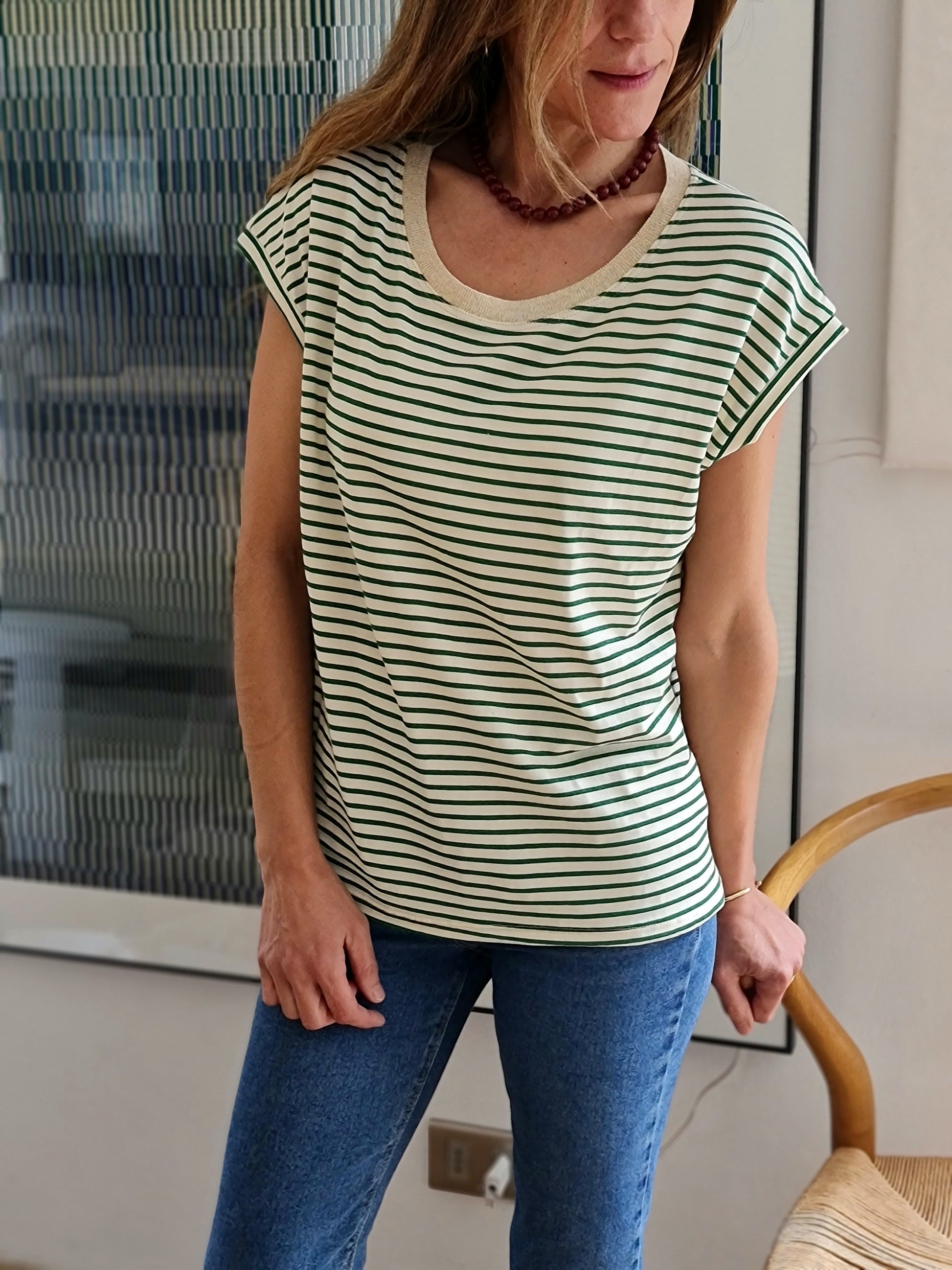 Polera de Algodon elasticado, muy rica calidad. Color fondo crema, rayado en líneas verde en lurex. Cuello redondo, la pretina en color lurex dorado.