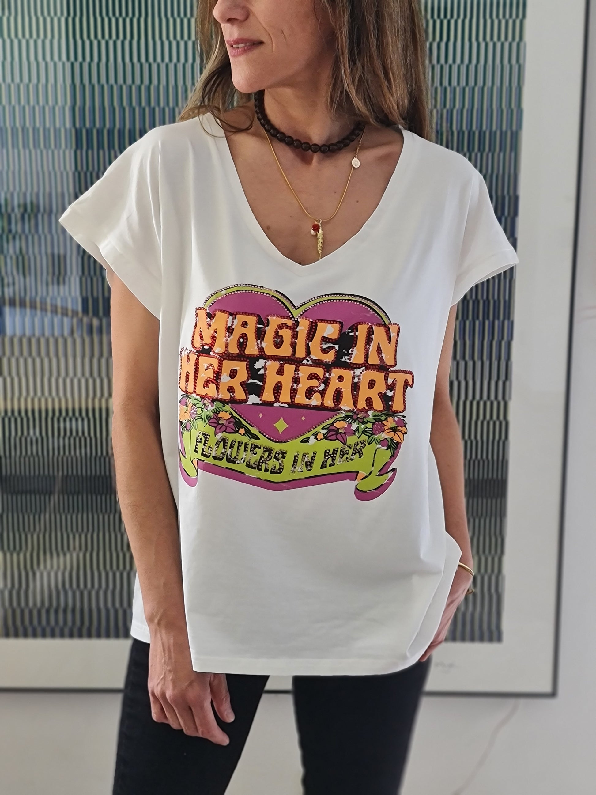 Polera de Algodon suave y elasticado. Corte ancho, levemente en A. Escote V amplio. Grafica con tachitas en color roko. Muy comoda, por su corte ancho y muy ondera.