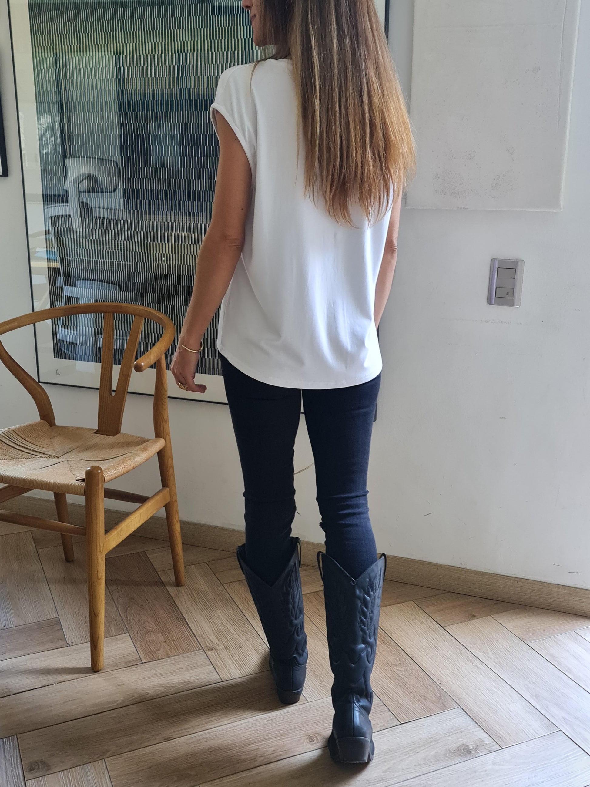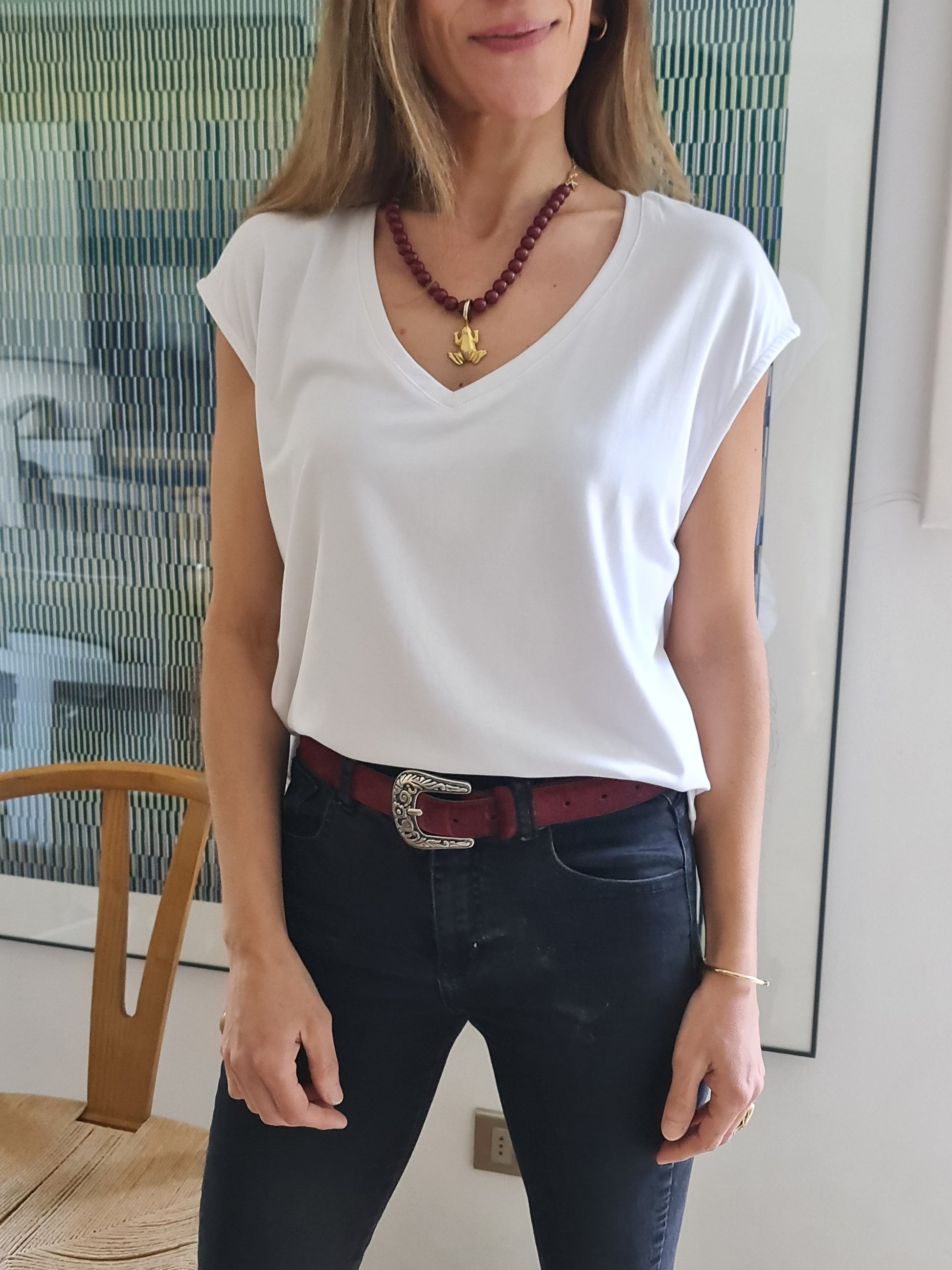 Polera Lola en color Gris , de Algodón Modal, muy suave, elasticada, con muy buena caída. Corte recto. Lola es una básica muy rica, con escote V muy sentador, perfecta para usar con todo.
