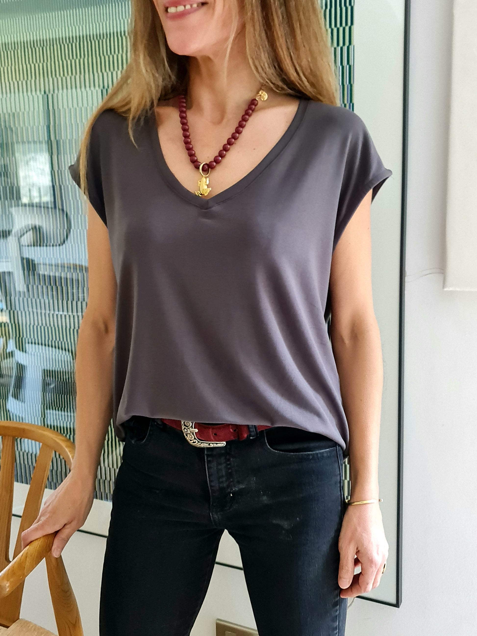 Polera Lola en color Gris , de Algodón Modal, muy suave, elasticada, con muy buena caída. Corte recto. Lola es una básica muy rica, con escote V muy sentador, perfecta para usar con todo.