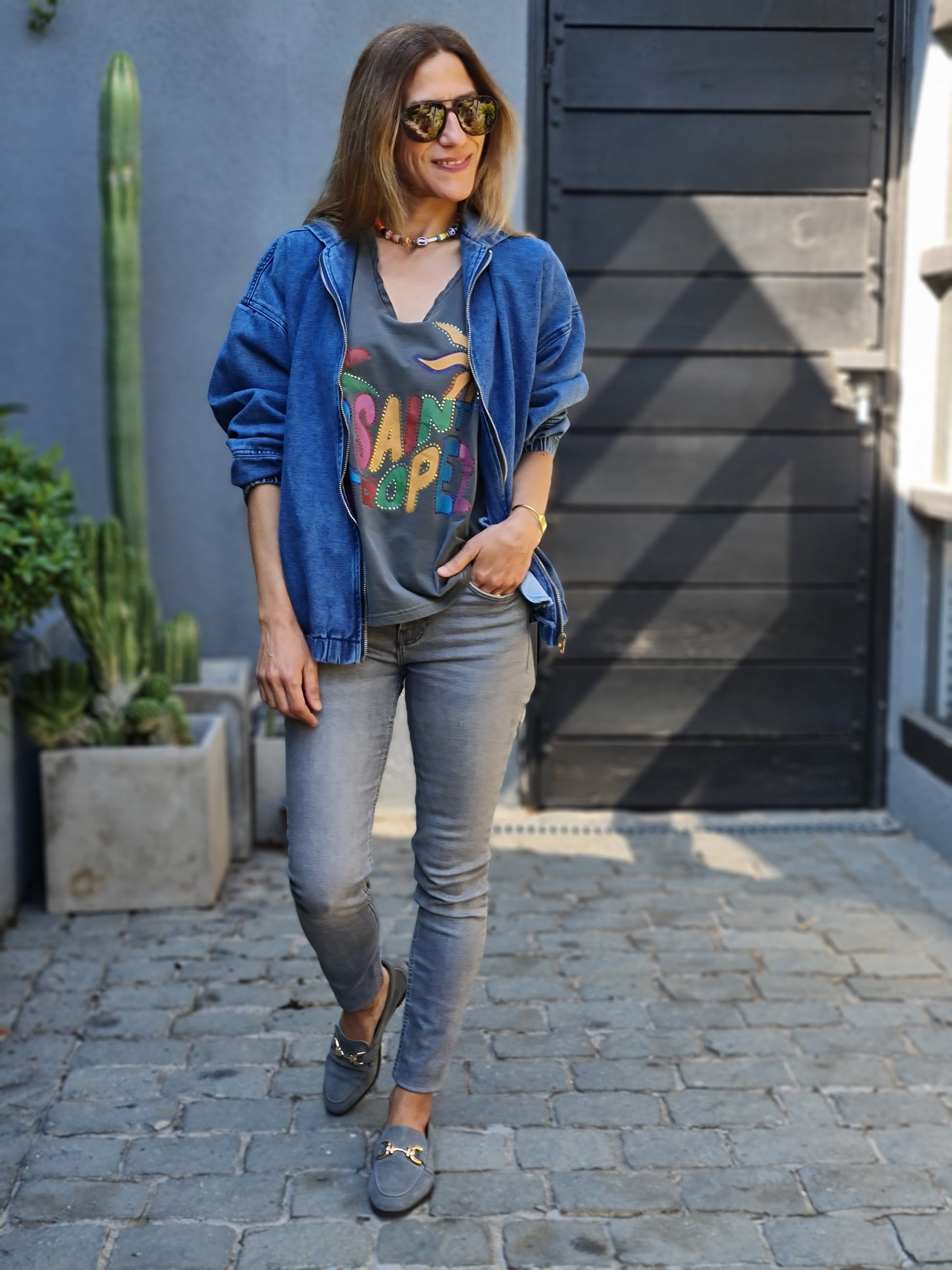 Polera de Algodon elasticado, en color gris gastado, muy rica calidad. Su corte es ancho, full comodo, con un precioso escote en V. Detalle de grafica alegre y veraniega con tachitas en colores.