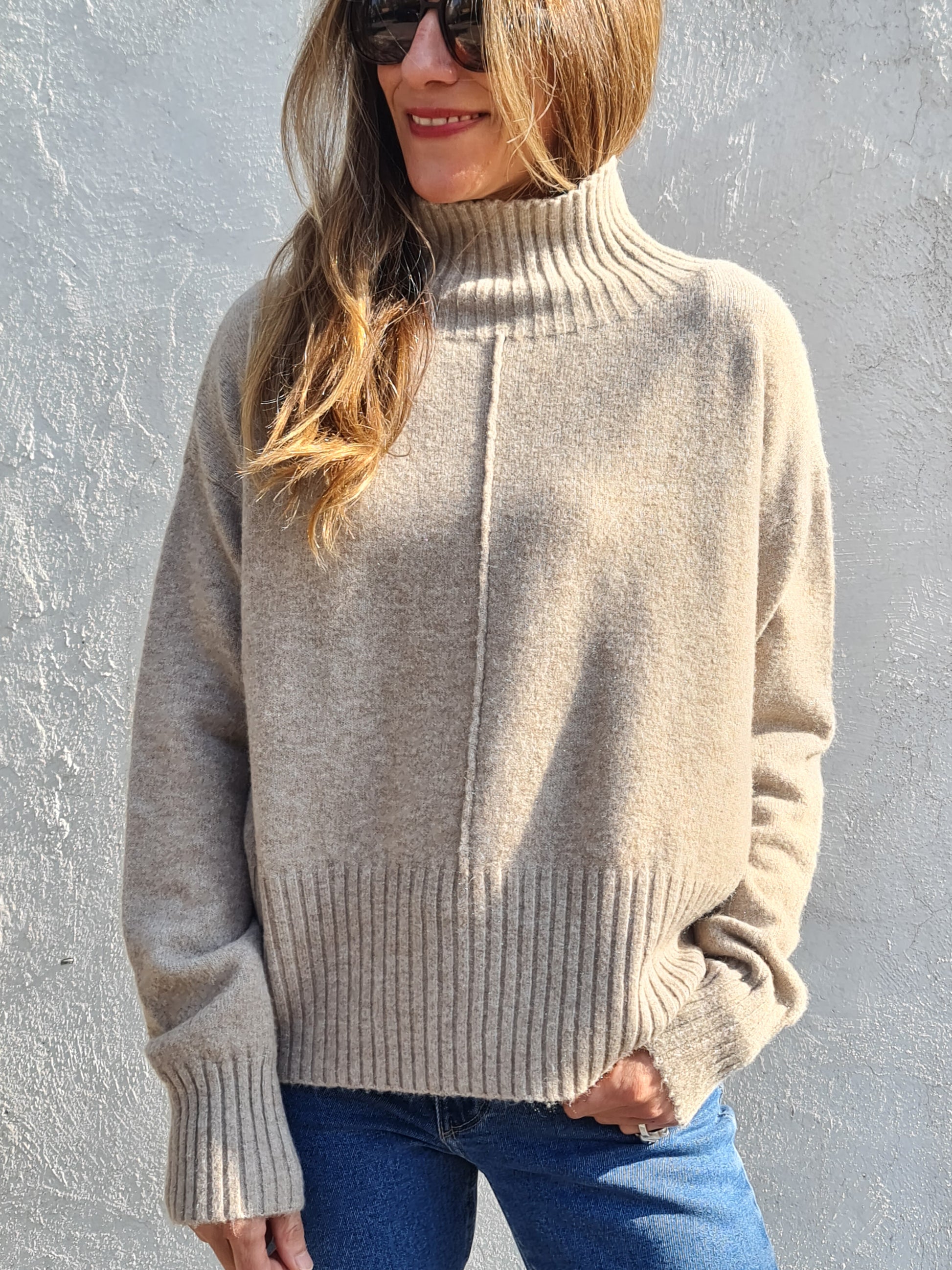 Sweater Marta de tejido muy suave y liviano. Corte recto, cuello semi alto ( no apreta) . Un clasico que puedes combinar con todo.
