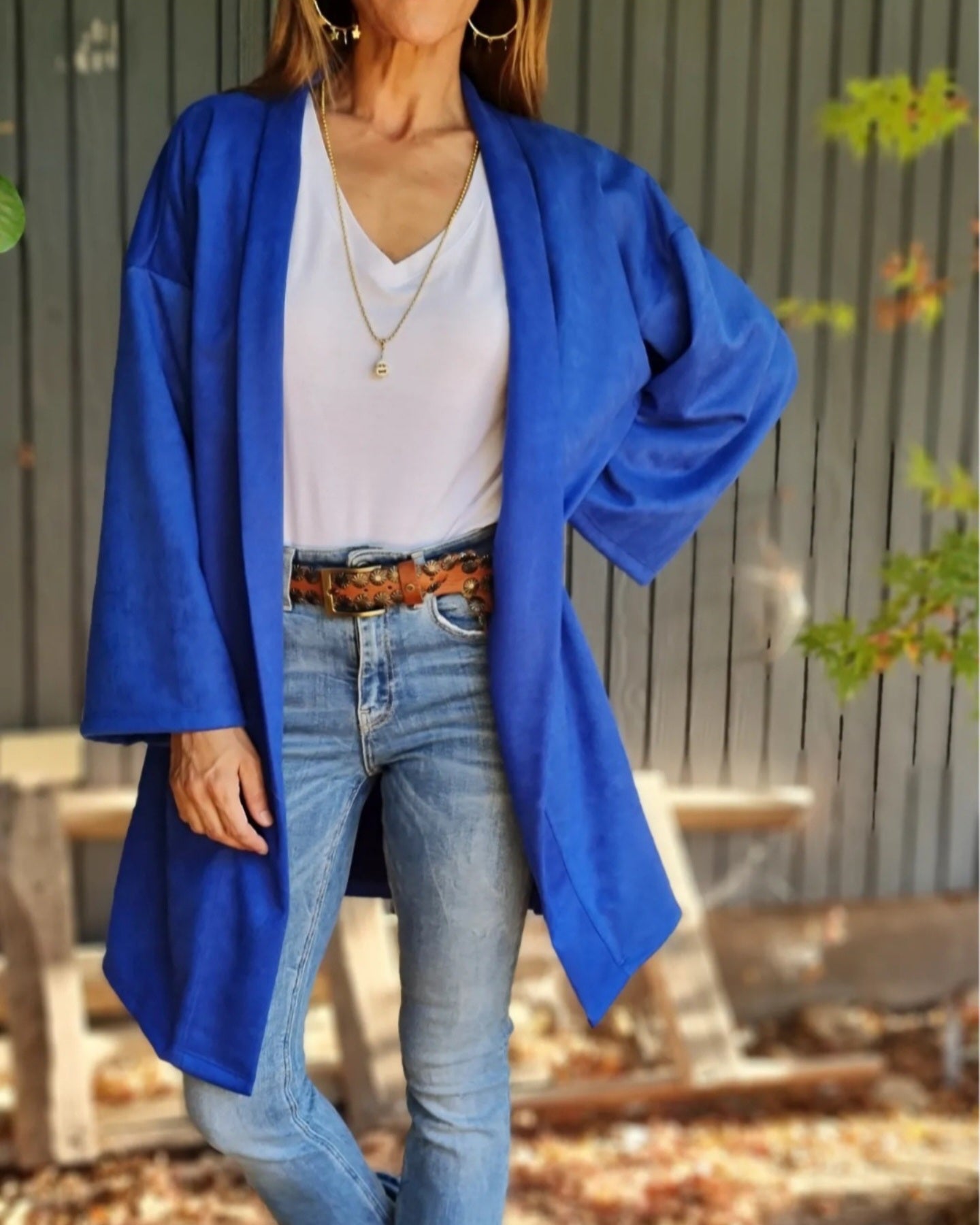 Tapado Gamuza Odette de simil gamuza, modelo ancho muy comodo, mangas rectas anchas muy comodas. Perfecto para usar con Blusas, poleras, top y Sweater. Es de tope, puedes usar la solapa abierta o doblada.